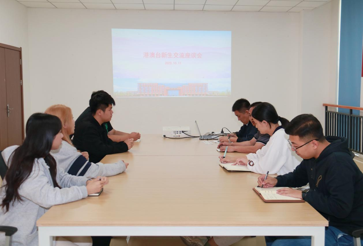 10月11日,学校在综合服务楼201会议室召开台港澳新生交流座谈会。统战部(台港澳事务办公室)副部长(副主任)杨延生、统战部(台港澳事务办公室)综合科科长吴磊、商学院辅导员吕海军、人文与外国语学院辅导员辛雪梅参加座谈。