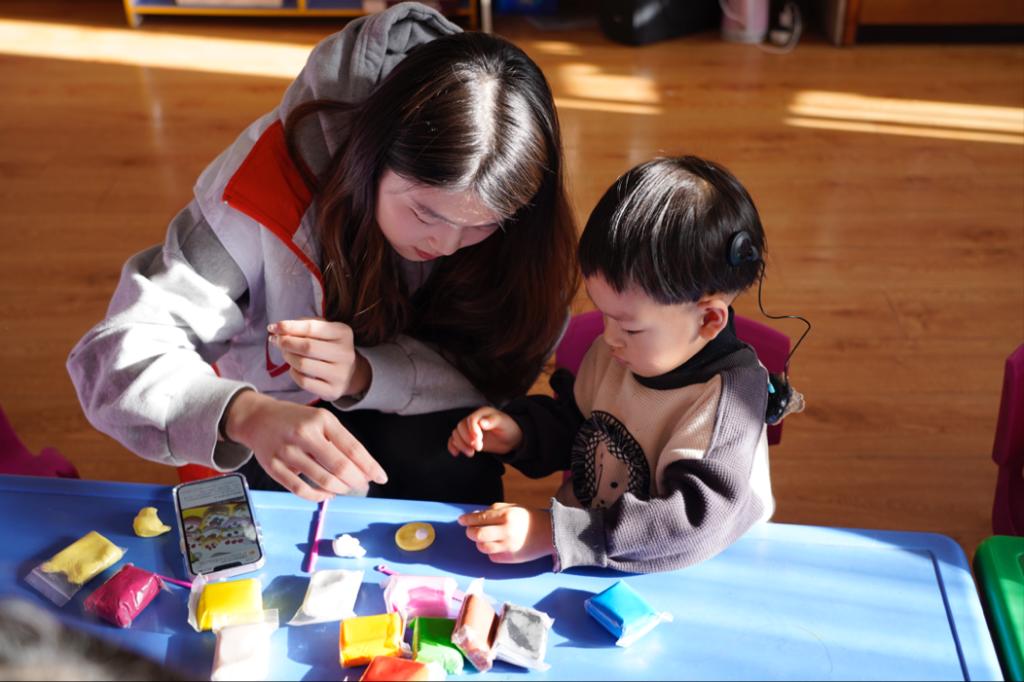 抵达康复中心后,志愿者们带领孩子们开展了粘土制作、绘画等系列艺术活动,让孩子们从中感受艺术之美。活动中,志愿者们亲身示范、耐心引导孩子们进行粘土制作,制作过程中,孩子们认真专注,当看到自己的作品时,孩子们稚嫩的小脸上洋溢出幸福的笑容。粘土制作以多彩的颜色和奇特的造型,运用艺术的非语言特质,提高了孩子们的审美力和创造力,在制作过程中产生心理疗愈效果,对孩子们的康复训练起到帮助作用。