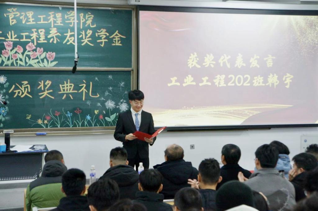 工程202班韩宇代表获奖学生发言,他向设立“工业工程系校友奖学金”的校友和学院表达了衷心的感谢,并表示要以优秀校友为标杆,珍惜时光、勤奋学习,锤炼意志品质,以新作为诠释磅礴的青春力量,回报母校、回报社会。校友代表高华锋发言,他表示,自己的成长得益于老师谆谆教诲,母校为他的专业学习和为人处世打下了良好根基,是他最初在社会上的立足之本,希望奖学金的设立能够助力有需要的学子成长,为学校培养更多有助于社会发展的有用之才尽自己的一份力量。