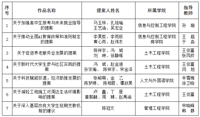 最终,经主办单位联合初审、专家评审等环节,我校提报的《关于加强高中生报考与未来就业指导的提案》《关于推动全国AI教育政策和准则制定的提案》《关于促进养老服务业发展的提案》《关于新时代大学生参与社区实践的提案》《关于科技赋能非遗,经济助推发展的提案》《关于减轻工地施工对周边生活环境影响的提案》《关于深入基层改良大学生短期支教机制的建议》7件作品荣获“大学组优秀提案”。