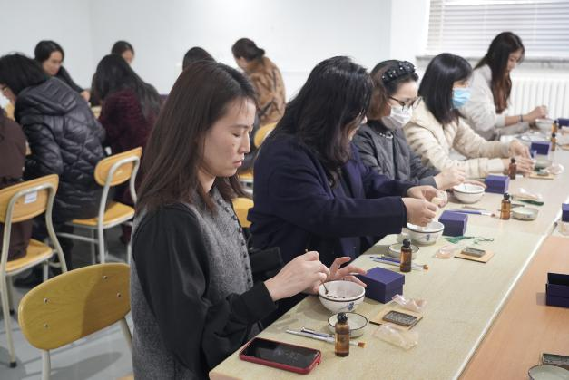 学院邀请了青岛市天恩合香非遗传承人徐红,带领教工一起制作古法香牌。徐红为大家展示了香的使用方式、香文化的历史发展以及香的类别等,让大家徜徉于香文化的前世今生,还特别将“沉、檀、龙、麝”四种名香样品向观众展示,让观众们有了更直观的了解。徐红演示了香牌制作流程,大家细心地将香泥反复搓揉、摔打,使用各式各样的模具,将揉搓好的香泥压入模具中,一块块芬芳浓郁、古色古香的香牌便制作完成。