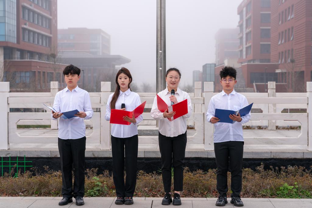 6点50分,伴随着学院国旗护卫队铿锵的脚步声,升旗仪式正式开始。“向国旗敬礼!”嘹亮的口令响起,国旗护卫队迈着铿锵有力的步伐护送国旗入场。伴随着振奋激昂的《义勇军进行曲》,擎旗手将鲜艳的五星红旗抛向天空,国旗迎着朝阳冉冉升起,迎风飘扬。退伍大学生代表李华霖以《接好时代的接力棒》为主题作国旗下的演讲,“爱国不是一句口号,而是我们每个人实实在在的行动,希望我们在国旗下的每一位同学,都用行动去践行爱国主义精神,接好时代的接力棒,一起为祖国的繁荣昌盛而努力奋斗!”管理工程学院管青先锋宣讲团带来主题朗诵《国家安全在身边》号召广大学子要居安思危,重视国家安全,守牢自己身边的安全阵地,每个人环环相扣,就能筑起国家安全的铜墙铁壁。