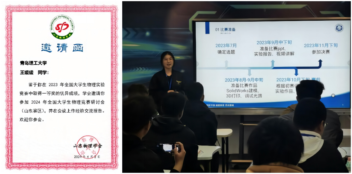 会议还邀请了往届竞赛一等奖获奖学生代表分享经验。我校王媛媛同学受邀汇报,她表示,对于竞赛要提早选题、尽快准备,掌握实验室基本工具的操作和建模渲染软件的运用,分享了备战竞赛的过程、携带仪器的注意事项、决赛时评委的着重关注点,并给下届参赛的同学们提出了备赛建议。