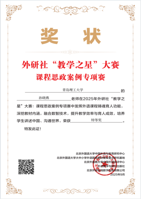 近年来,孙晓燕老师负责的《大学英语AII》课程团队积极致力于大学英语课程建设。自2021年获批省一流本科课程以来,课程团队不断创新进取,先后开发了《大学英语AII》《大学英语AII(新视野 第四版)》慕课,并在“学银在线”正式运行,其中,《大学英语AII》课程获批山东省高等学校在线开放课程平台上线课程。此次在“教学之星”大赛课程思政案例专项赛中取得的优异成绩,是学院领导长期以来对课程思政工作高度重视的成果,也是课程负责人和团队成员辛勤耕耘的结晶,彰显了我院在课程思政建设方面的显著成效。(撰稿:孙晓燕、周文明;审核:郭印、王星)