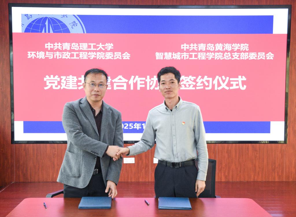 环境与市政工程学院党委副书记隋学智、黄海学院智慧城市工程学院党总支副书记潘月宇共同签署《党建共建合作协议》,双方将建立“定期交流机制”“资源共享机制”“联合实践机制”,以二级学院为主体,推动党建与业务深度融合,打造校际协同发展的“微单元”样板。