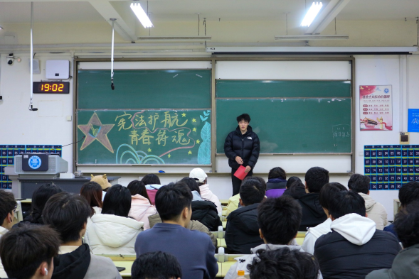 法治电影观影活动中,各班团支书组织同学集体观看《第二十条》法治主题影片,在光影故事里感受“法律面前人人平等”的原则,体会宪法对个体权利的坚实保障。观影结束后,同学们围坐讨论,结合影片情节分享自己对“宪法与生活”的理解,让抽象的法治精神变成了可感可触的成长感悟。在“宪法护航・青春铸魂”宪法宣誓活动现场,在领誓人的带领下,同学们举起右拳庄严宣誓,铿锵有力的誓言回荡在校园,传递着青年学子对宪法的尊崇与坚守。