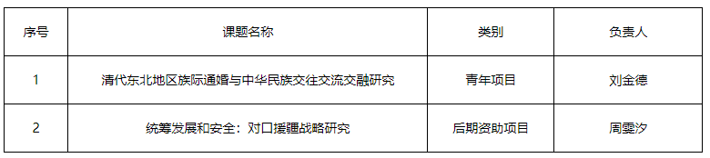 其中,刘金德副教授主持申报的《清代东北地区族际通婚与中华民族交往交流交融研究》,获批民族研究项目公开招标青年项目;周雯汐博士主持的《统筹发展和安全:对口援疆战略研究》,获批民族研究项目后期资助一般课题。