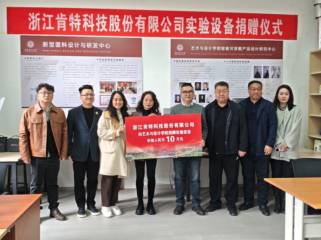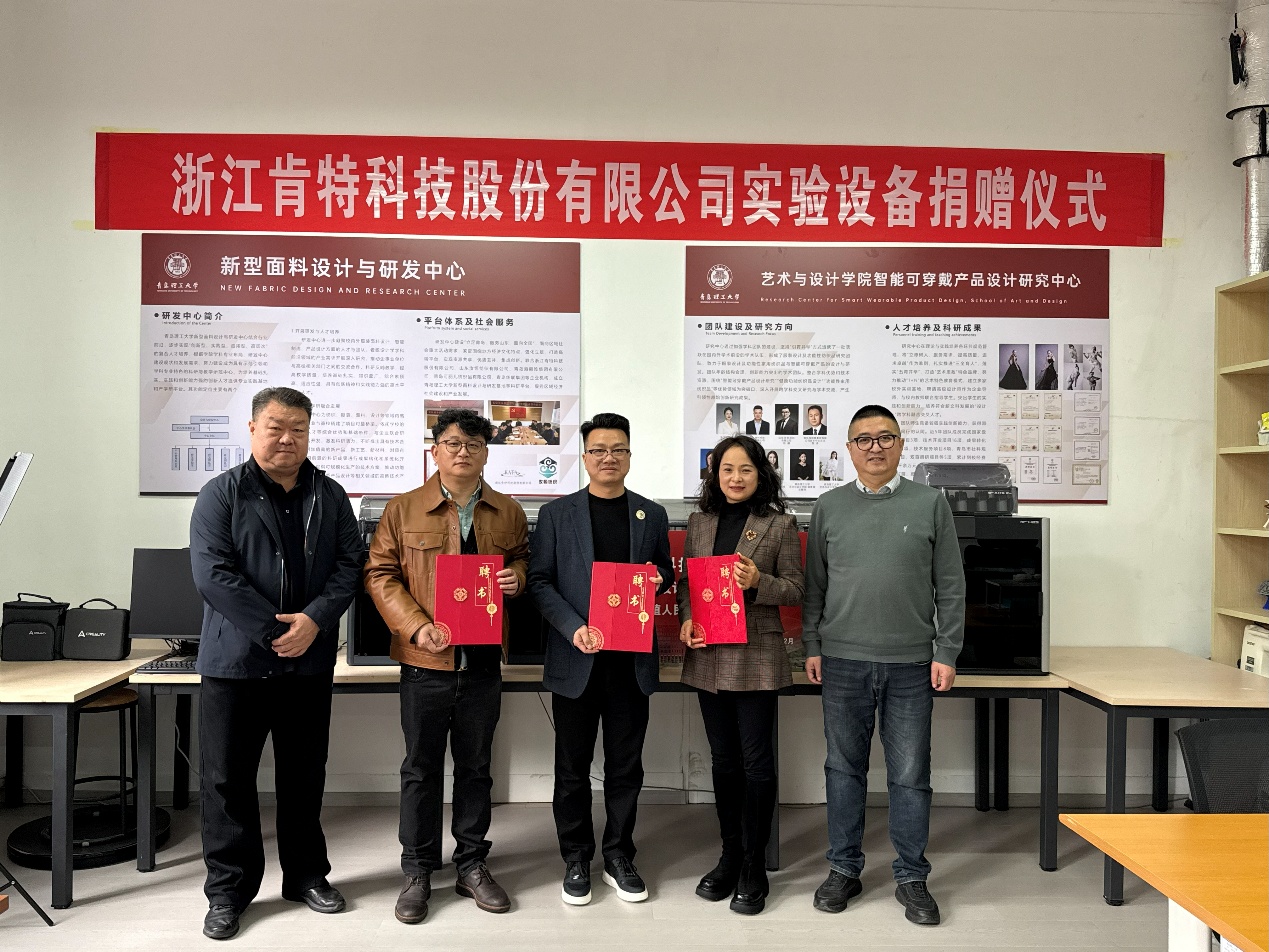 浙江肯特科技股份有限公司、山东汝恒纺织有限公司,在艺术与设计学院设立面料研发与设计基地,首次合作项目签约30万元成果转化协议。此次捐赠的3D打印机和人体扫描仪等实验设备,将助力提升学院科研与教学水平,培养具有创新精神和实践能力的高素质应用型人才。
