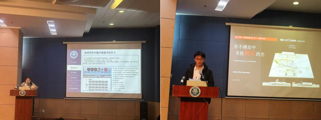 优秀指导教师代表沈祺老师分享了育人故事与教学心得,他结合指导学生参与专业竞赛的经历,鼓励同学们要夯实基础、保持信心,勇于探索,一定会取得理想成绩。优秀学生代表袁千惠、菅子彤、潘建成同学分别从保研、国家奖学金、专业竞赛方面分享了他们的成长故事与经验心得,为同学们的成长提供了清晰的路径。分享干货满满,真挚感人,赢得现场师生的阵阵掌声。