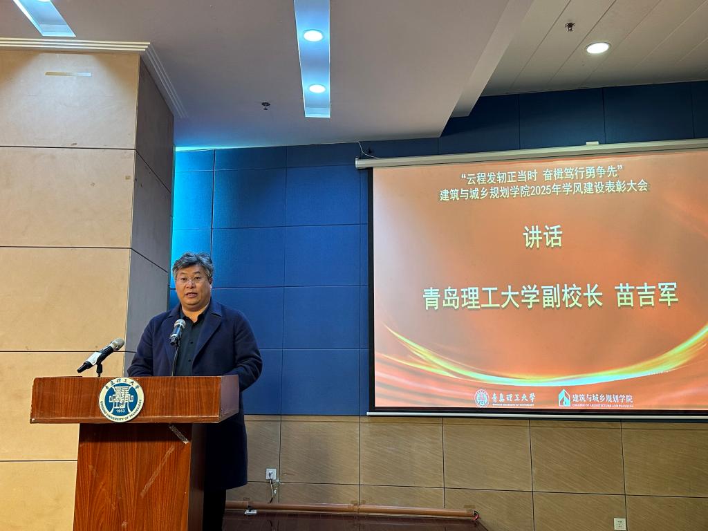 为表彰先进,树立榜样,深化学风建设,12月10日,建筑与城乡规划学院在市北校区图书馆学术报告厅举行2025年度优良学风建设表彰大会。校党委常委、副校长苗吉军,学院领导班子成员及全体辅导员、师生代表共计300余人出席大会。大会由学院党委书记吕楠主持。