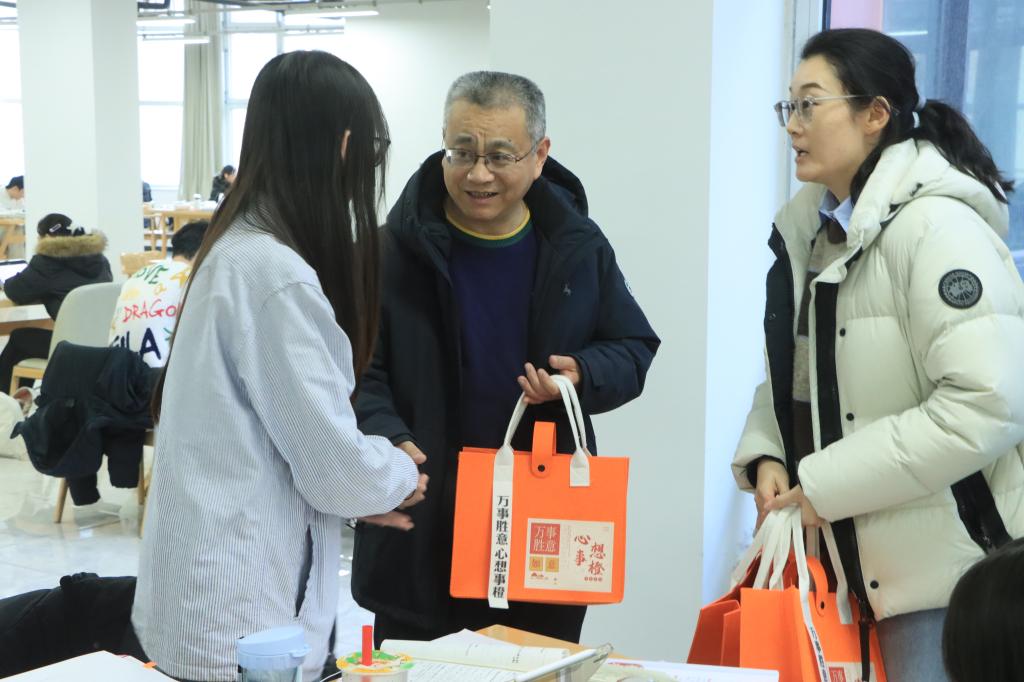 学院提前谋划、精心挑选,将一份份承载着祝福的“暖心礼包”打包整理。活动现场,学院领导将精心准备的“考研暖心礼包”逐一送到考研学子手中。礼包内含寓意“笔扫千军”的文具,满载祝福的贺卡、书签,寓意“心想事橙”的橙子以及冬日暖心暖贴,让同学们在紧张备考中感受到学院的贴心关怀与温暖力量。