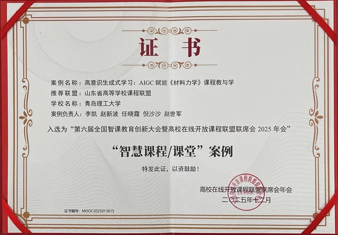 12月13日,第六届全国智课教育创新大会暨高校在线开放课程联盟联席会2025年会在武汉召开。会上公布了“AI数智技术与智慧慕课助力教育数字化转型”优秀案例遴选结果,理学院李凯教授负责的《材料力学》课程入选,获评“智慧课程/课堂”优秀案例。该课程案例获山东省高等学校课程联盟2025年度课程教学优秀案例一等奖后,经省课程联盟推荐,荣获第六届全国智课教育创新大会“优秀案例”,成为学校本年度唯一获此殊荣的教学案例。