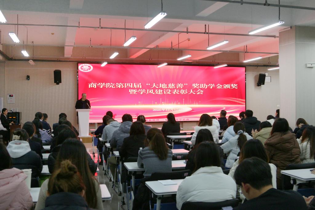 为深入学习贯彻党的二十届四中全会精神,全面落实教育强国建设部署要求,表彰先进、树立典型,12月17日,商学院在学院楼401报告厅举行第四届“大地慈善”奖助学金颁奖暨学风建设表彰大会。校党委常委、副校长陈连军,山东大地公益慈善基金会理事、北京大地泰华会计师事务所(特殊普通合伙)人力资源总监陈晓培,学院领导班子成员及师生代表180余人参加大会。会议由学院党委书记肖学斌主持。