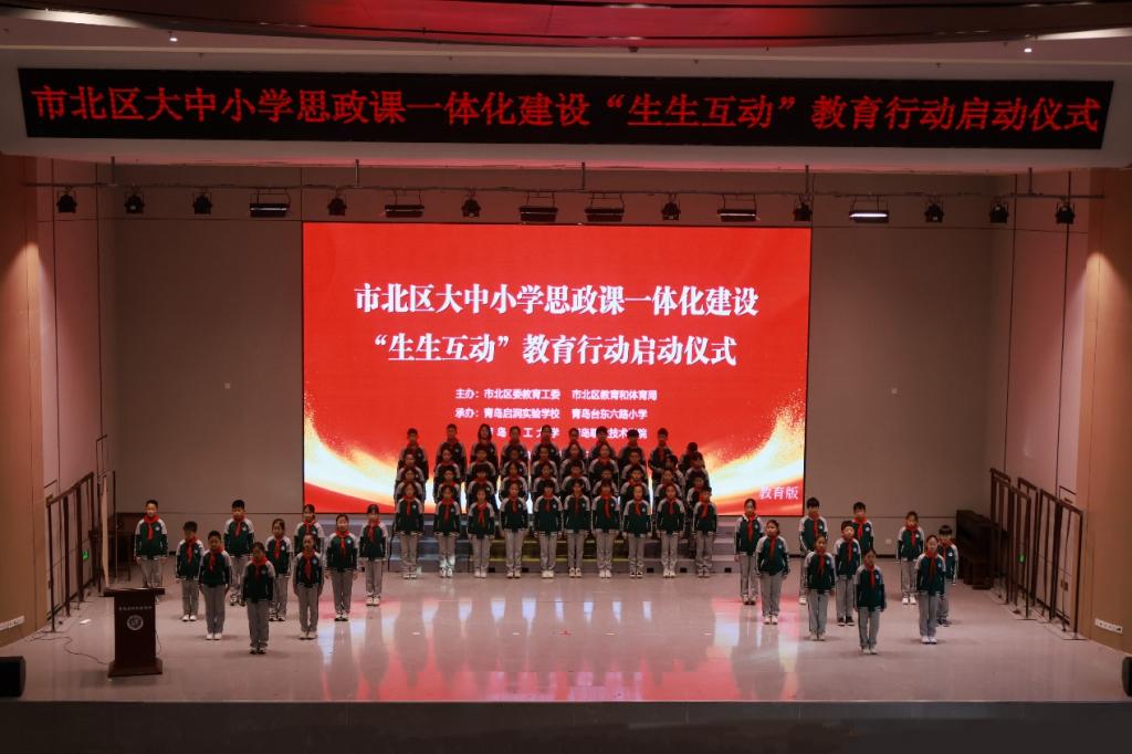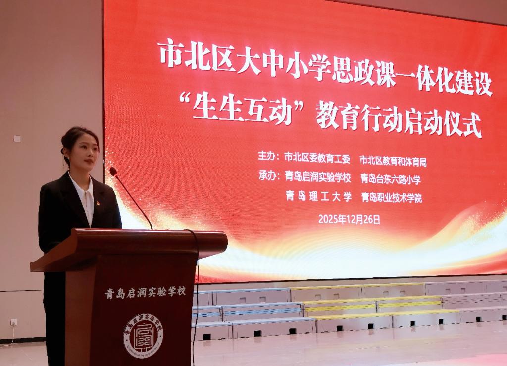 为切实整合青岛市各学段思政教育优质资源,深入推进我市大中小学思想政治教育一体化建设,12月26日,马克思主义学院协同青岛职业技术学院、青岛启润实验学校、青岛台东六路小学,在市北区教育和体育局的精心组织下,共同承办市北区大中小学思政课一体化建设“生生互动”教育行动启动仪式。青岛市教育局思想政治与德育工作处二级调研员孙建中,市北区教育和体育局党组成员、副局长翟春燕,马克思主义学院院长华章琳、院长助理王鹏,青岛职业技术学院马克思主义学院副院长王洪娇等有关部门负责人出席本次活动。