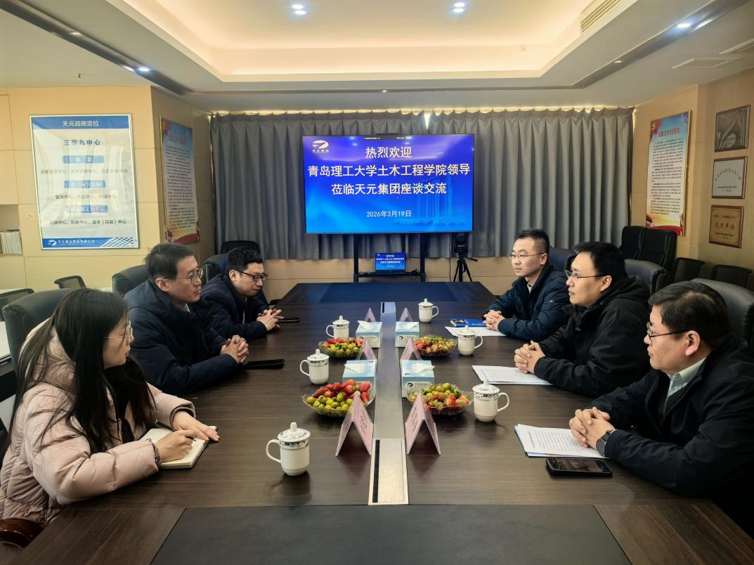 在天元集团,学院一行与集团人力资源部副总经理杨亮、青岛一公司副总经理商军锋、青岛二公司副总经理徐富强等进行了座谈交流。王鹏飞介绍了土木工程学院的专业设置、办学特色、师资力量以及2026届毕业生的整体情况。杨亮对土木工程学院的人才培养质量给予了高度评价,并详细介绍了集团的发展历程、企业规模、业务板块以及未来的战略布局。他表示,期待通过此次交流,与学院建立深层次、多形式的合作机制,共同探索人才培养新模式。