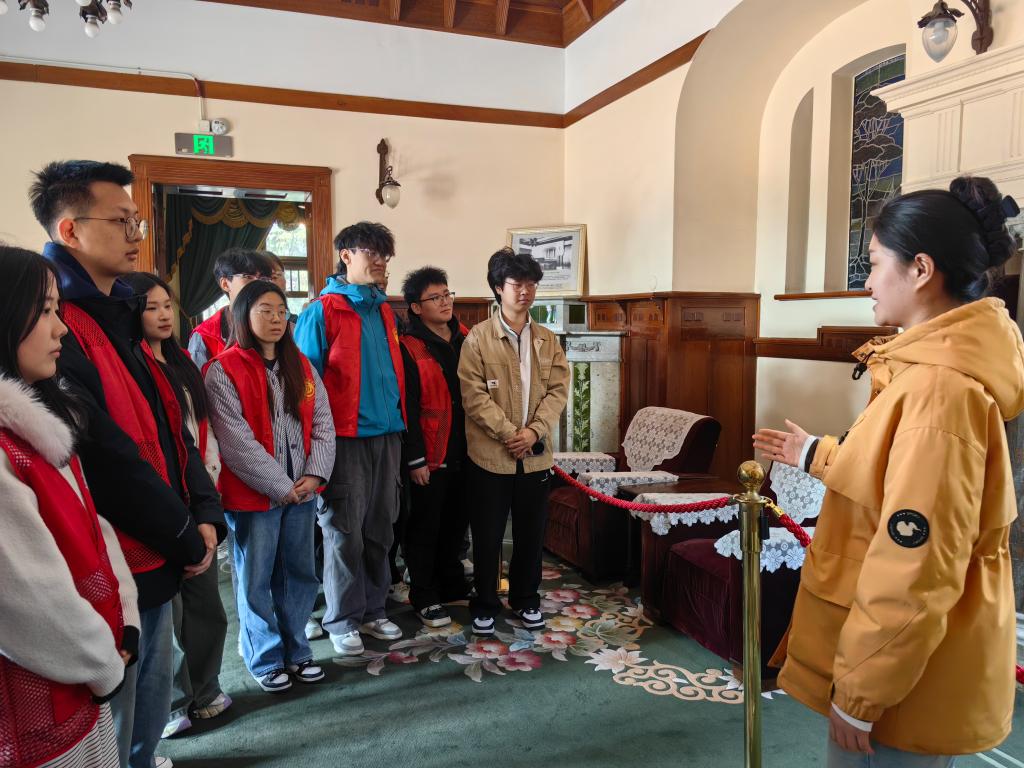 随后,全体人员前往德国总督楼旧址博物馆(迎宾馆)开展研学。这座百年建筑见证了青岛历史变迁,更留存着1957年毛泽东主席在此下榻的红色记忆。学院研究生程缘圆围绕毛主席在青期间深入基层、心系群众的感人故事展开现场宣讲,引导大家感悟革命领袖求真务实、心系人民的崇高风范。大家纷纷表示,作为理科学生,不仅要学好专业知识,更要学习老一辈革命家心系人民、求真务实的崇高风范,将个人理想融入国家发展大局。