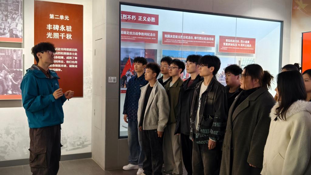在青岛市革命烈士纪念馆“山河魂”烈士群雕前,全体人员整齐列队、肃立默哀,向为民族解放与人民幸福献身的革命先烈致以崇高敬意,并依次敬献鲜花,寄托深切哀思。走进纪念馆展厅,师生们驻足于历史照片与烈士遗物前,重温革命先辈浴血奋战的峥嵘岁月。学院“红色宣讲轻骑兵”成员、物理学专业硕士生刘均结合参观感悟,动情讲述英烈事迹,用青年视角传递信仰力量,让在场师生深受触动。