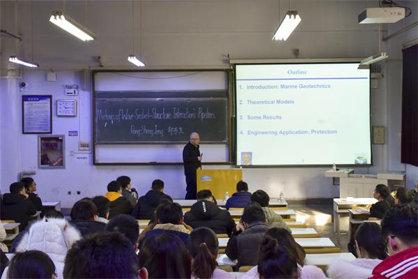 郑东生对自己的研究以及工作经历和对海底管道的建模和应用过程问题进行了介绍。他向在座师生介绍了部分外国的管线工程和参观、参与的相关工程项目。随后,郑东生从Introduction、Theoretical Models、 Some Results、 Engineering Application Protection四个方面介绍了海底管道建模、应用过程。介绍过程中,郑东生使用例子详细地介绍了The nature of wave loading和Basic Mechanics,包括瞬时液化和累积液化的问题。同时,郑东生对其进行计算的方式以及其著作进行了介绍,对计算与实验的差异进行分析。最后,郑东生进行了现场答疑,在座师生踊跃提问,现场反响热烈。