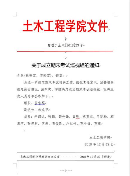 严考风方能正学风,正学风方能树校风。土木工程学院通过精细化分工、明确责任、一体两翼联动机制把考试作弊消灭在萌芽状态,确保考试公平。加大对考生的宣传教育力度,组织考生认真学习学校相关规定,充分认识到考试违纪的危害。在本学期巡考工作中已经处置多起突发事件,多次帮助考生解决实际问题,对不良考风起到很好的震慑作用。(撰稿:张立伟、王中帅 审核:苗吉军、曲成平)