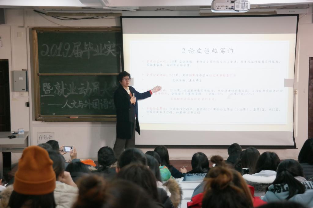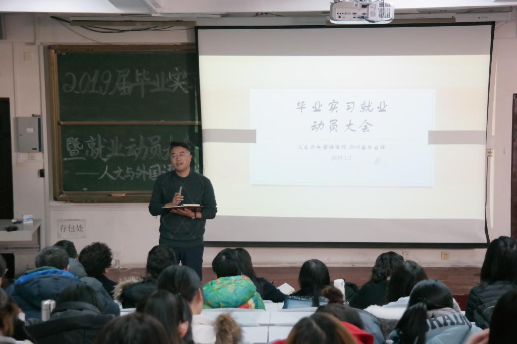 1月8日下午,2019届毕业实习就业动员大会于长江路校区二教阶梯教室302举行。人文与外国语学院院长巩湘红、副院长王晓东、党总支副书记王振、辅导员陈刚、各专业导师及2019届毕业生参加本次大会。