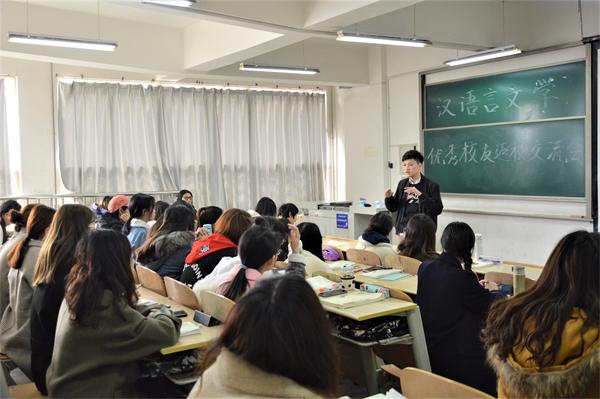 为激励在校大学生努力学习,励志成才,毕业后更好地与社会对接,3月6日上午,人文与外国语学院汉语言专业举办优秀校友返校交流会。2017届汉语言文学专业毕业生赵灿应邀到校交流,分享励志故事,交流创业体会,畅谈人生感悟。交流会由汉语言文学专业教研室张成福主任主持,周汝萍老师及汉语言文学171班全体同学聆听了优秀校友的事迹交流。