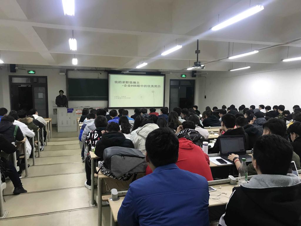 王禄详细解读了职业教育和大学生就业指导服务、大学生创业指导与扶持的相关政策,就同学们关注的热点问题进行了交流;徐海龙为同学们做了“我的求职我做主--企业HR眼中的优秀简历”主题报告,他指出,简历制作应该是相关材料加上特点总结,而相关材料尤为重要,他多次提到“简历是做出来的,而不是写出来的”,并提醒学生要注意的小细节,如:照片一定用正装照、简历不要拖沓冗长等;李亮通过详实的案例带领大家一起了解如何进行科学的、系统的职业生涯发展规划,并详细介绍了实施职业生涯发展规划的步骤和注意事项。