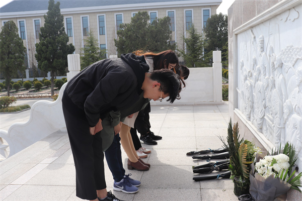 抵达陵园后,大家参观革命烈士生平事迹,重温中国共产党的发展历程以及青岛市黄岛区的革命史瞻仰烈士遗物,在“革命烈士永垂不朽”的纪念碑前,敬献鲜花,集体默哀三分钟,缅怀革命先烈。学生会副主席张均带领25名团员在墓碑前进行新团员入团宣誓和老团员重温入团誓词,增强仪式感召力。盛琳媛作为学生干部代表发言,表示作为学生干部,将紧跟时代步伐,传承红色基因,在学院中积极弘扬爱国主义及“四个自信”,无愧于革命先烈。