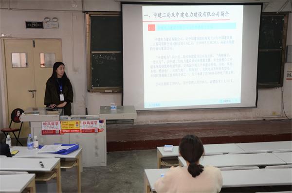 为拓宽学院学子的就业渠道,3月27日下午,管理工程学院于二教阶202举办中建电力建设有限公司招聘宣讲会。公司招聘经理邓康鑫、黄芳参加此次会议,黄芳担任主讲人。