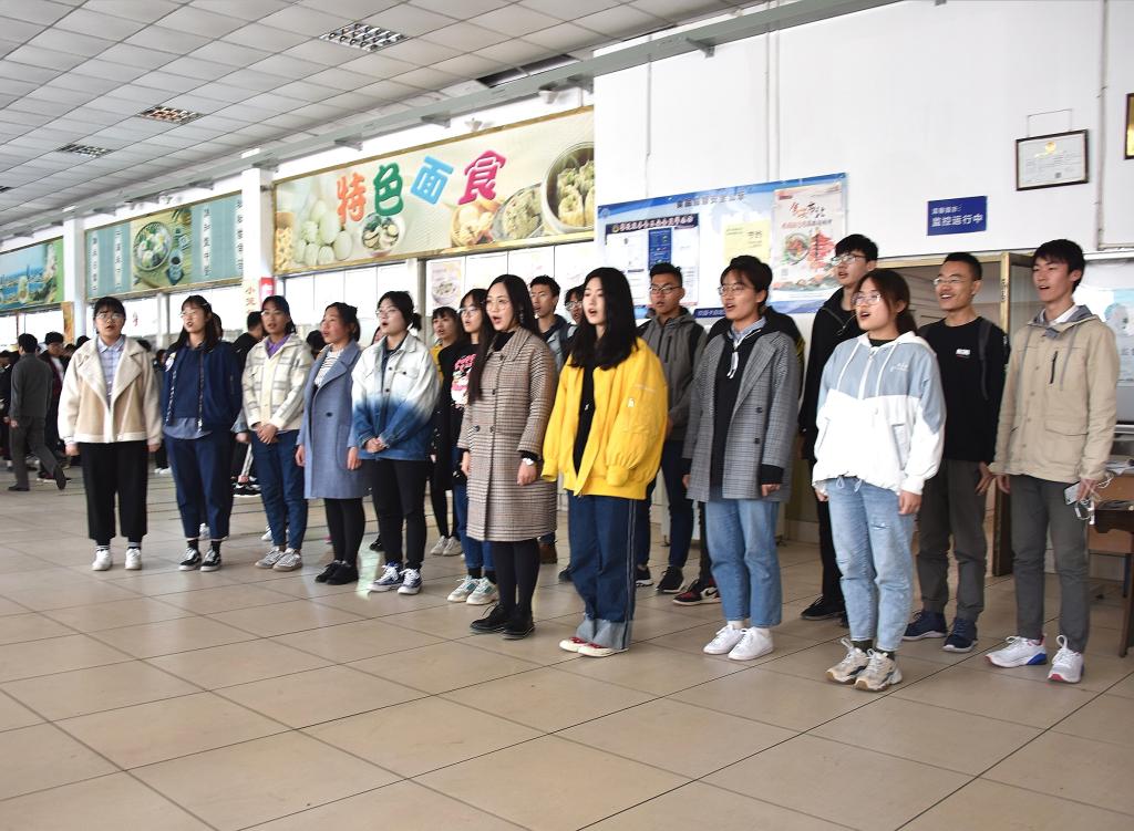 当天,熙熙攘攘的北院食堂与往日一样温馨,12:15,一阵悠扬的古筝伴奏声从食堂中央响起,演奏的正是大家耳熟能详的《我和我的祖国》旋律。主唱演员深情动人的歌声感染了现场观众,正在食堂用餐的师生纷纷被吸引,路过的同学都不由自主地放慢脚步,或拍照留影,或轻声跟唱,整个活动场面气氛和谐。