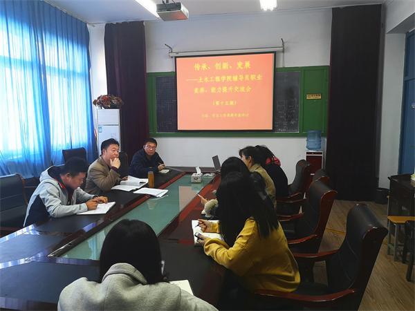 4月4日上午,土木工程学院在一教306会议室举办第十五期辅导员职业素养、能力提升交流会。学院党总支副书记邵先锋,学生工作办公室主任、分团委书记王中帅及全体辅导员老师参加本次交流会。本次交流会重点对学生工作课题申报相关内容进行研讨。