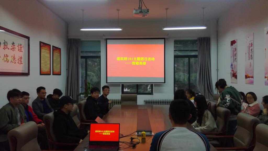 建筑研182班的主题团日活动在全体齐唱共青团团歌中开始,随后,团支书刘阳带领大家庄重地重温入团誓言。同学们共同观看了纪念先烈的视频,视频中的先烈事迹令同学们钦佩感动。最后,同学们开展热烈的讨论,结合自身实际表达了观看视频的感悟。