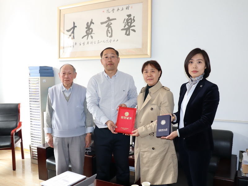 包春凤女士受托向学院捐赠两册《比萨斜塔永久稳定方案设计》,曲成平代表学院向包女士颁发受赠证书。