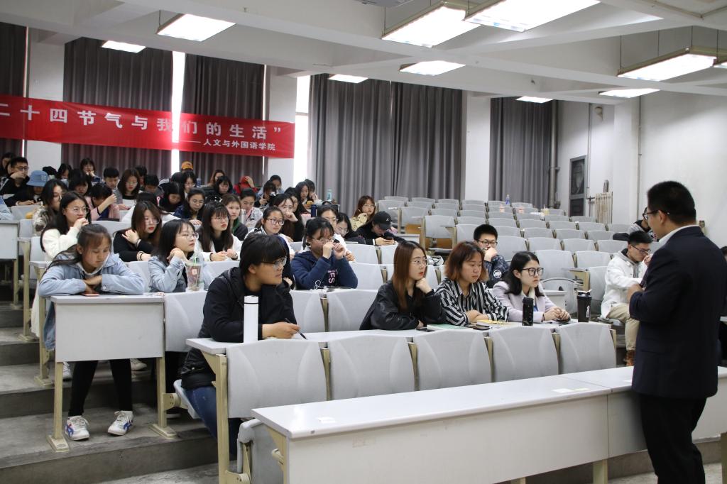 品国学经典,悟国学风骨,领国学风韵。学院本学期将继续以“品国学之美,承文化新火”为主题,分别以开展“国学之技、国学之音,国学大讲堂”三种形式全面展开国学文化活动。国学大讲堂也是国学文化节的领国学风韵的重要环节,一首节气歌,记录了中国古代劳动人民在田间耕作长期经验的积累和智慧,也见证了人类文化的多样性。此次讲座不仅使同学们充分了解二十四节气与我们生活的关系,更增强学生对中华传统文化自信和坚定文化传承的意识。(撰稿:马松;审核:王振)