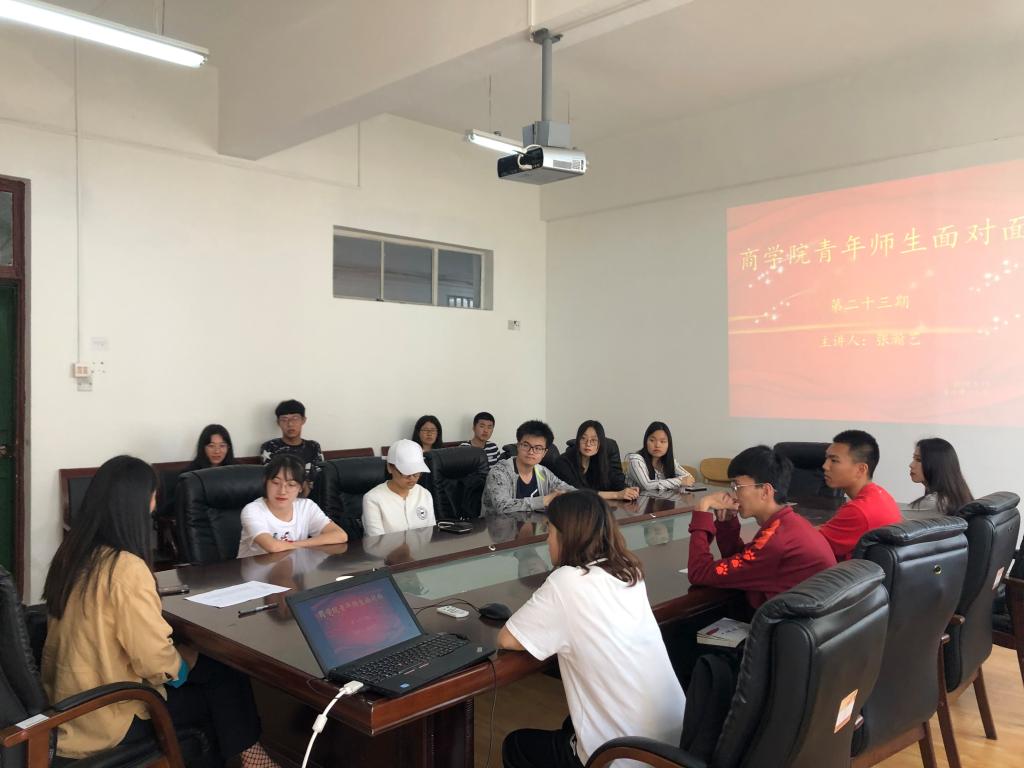 5月15日下午,商学院于长江路校区一教318室举行第二十三期“青年师生面对面”活动,本活动由国际商务与贸易专业张瀚艺老师主讲,商学院20名同学参加。