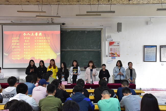 5月15日,土木工程学院在一教三阶北举办春季运动会总结表彰大会,学院党总支副书记邵先锋,学生工作办公室主任、分团委书记王中帅,辅导员杜诗琳、马蓉蓉、徐杨杨及获奖运动员代表参加本次表彰会。