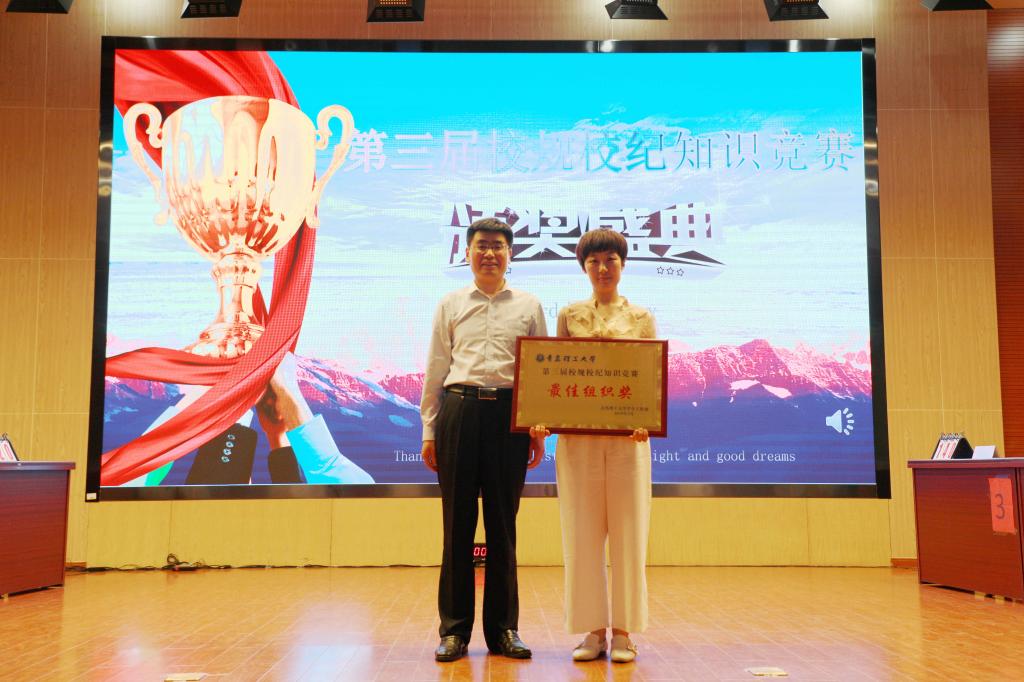 5月22日,我校临沂校区第三届校规校纪知识竞赛决赛在图书馆报告厅举行。校区党委常务副书记李国涛、校区管理办公室主任范学工、学生工作部副主任、团委书记刘宗庆出席并颁奖,教务部、学工部及各系相关负责老师担任评委。