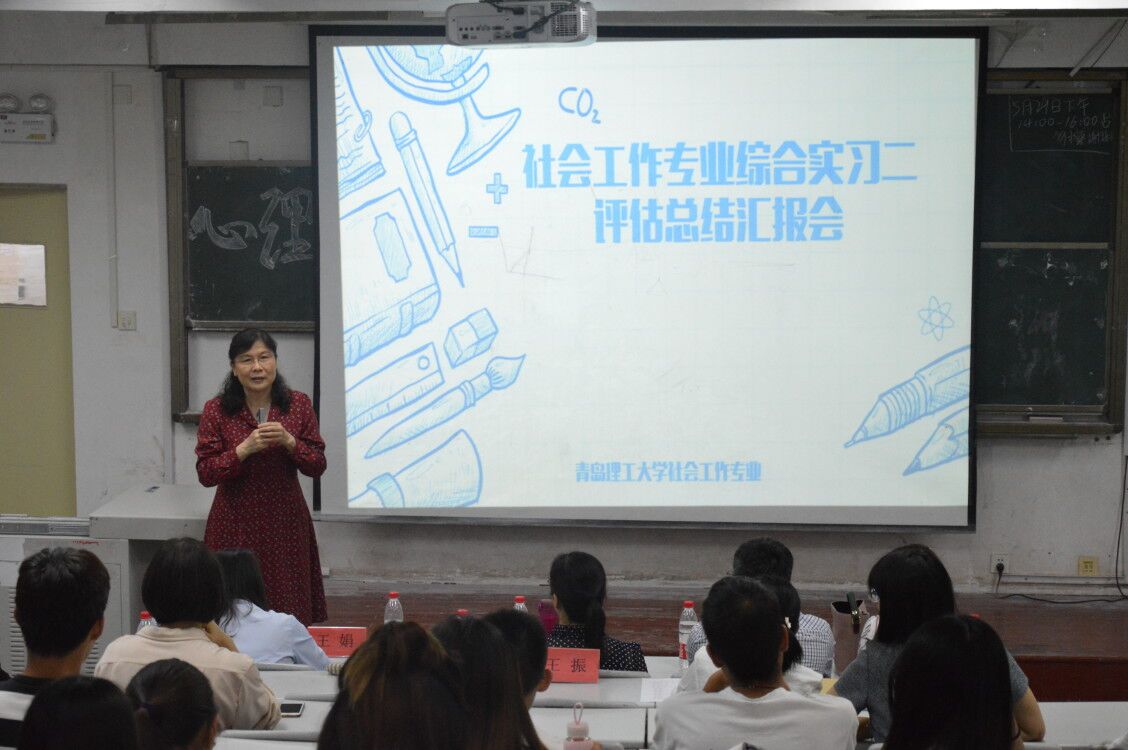 刘世颖首先介绍本次汇报会的流程、评分要求及实习的总体情况。2016级学生实习组依次上台进行汇报,图文并茂地展示在实习中的丰富经历和自身收获。汇报结束后,王新总结发言,她首先向实习期间提供实习平台和资源的各实习单位致以真挚的感谢,充分肯定本次实习效果,表达了对社工专业的进一步发展的深切期盼,呼吁社会工作专业学生要自觉进行理论实践,为西海岸新区的发展做出积极贡献。最后,工作人员发放2016级学生在一年前写给自己的信件,此举意在通过这些信件让学生审视自身成长与不足。