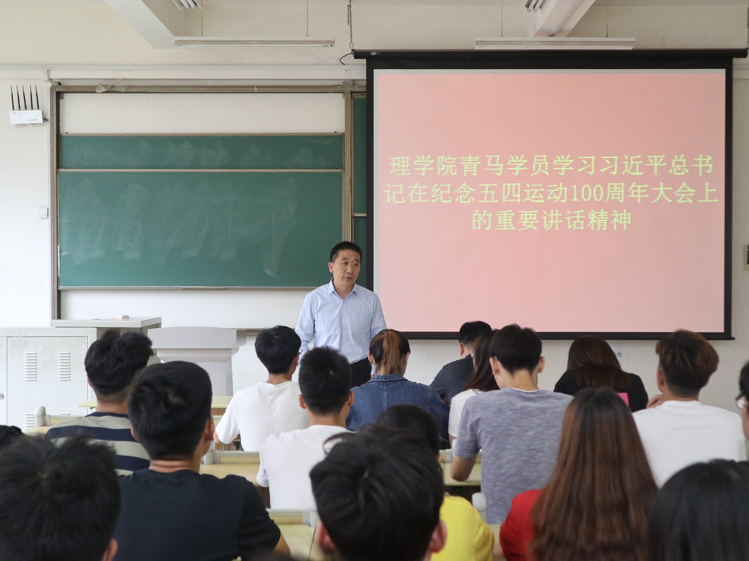 6月5日,理学院青马学员在嘉陵江路校区集体学习习近平总书记在纪念五四运动100周年大会上的重要讲话精神。党总支副书记刘聘、分团委书记李晓辉参加学习。