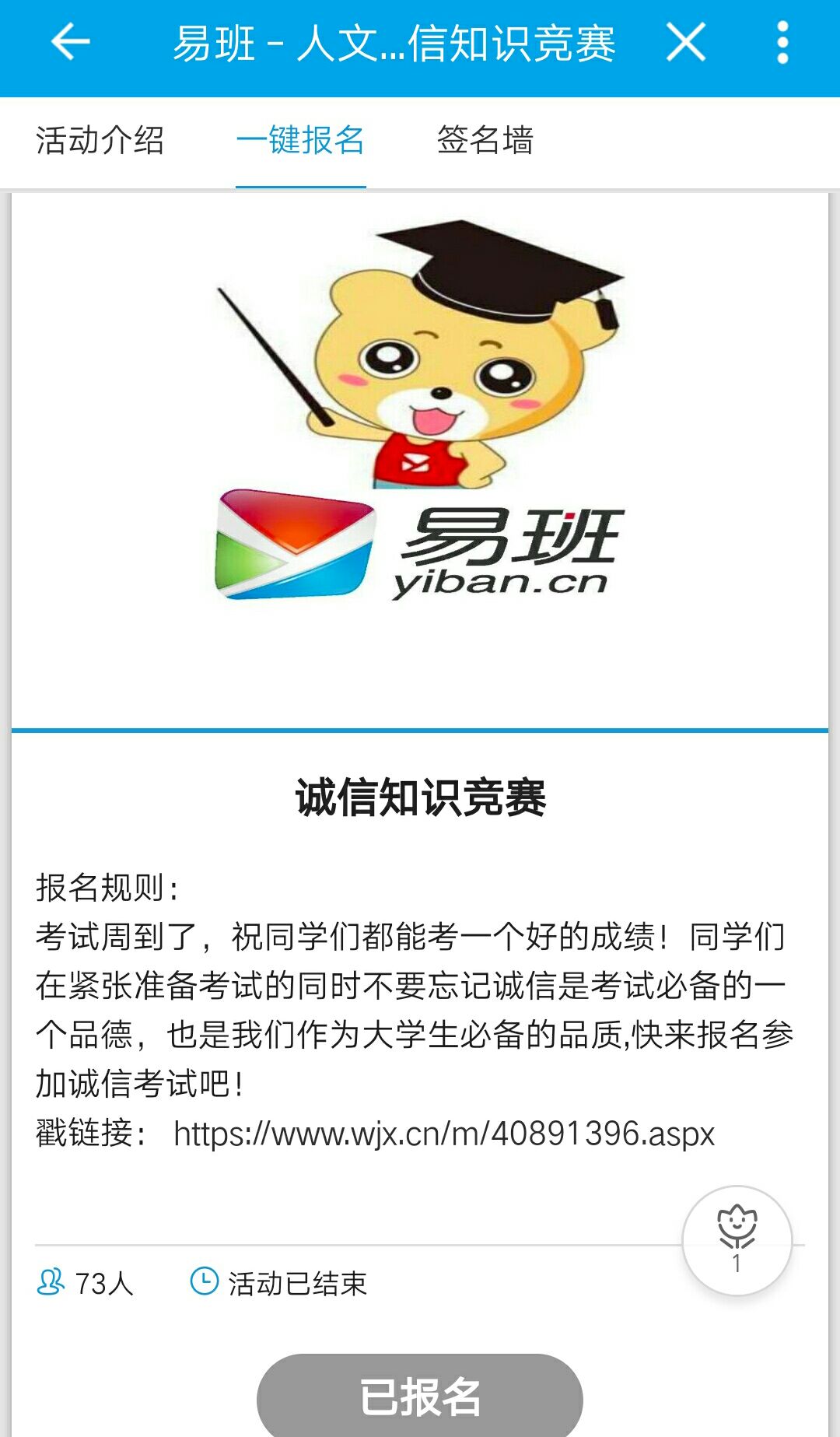 为构建诚信校园,宣传学生资助政策,培养大学生的诚信意识和观念,进一步教育引导学生树立正确的人生观、价值观和荣辱观,营造诚实诚信的学风考风,6月11日,人文与外国语学院易班工作站联合学生会举办易班App诚信主题知识竞赛的活动,近百名学生参与此次活动。