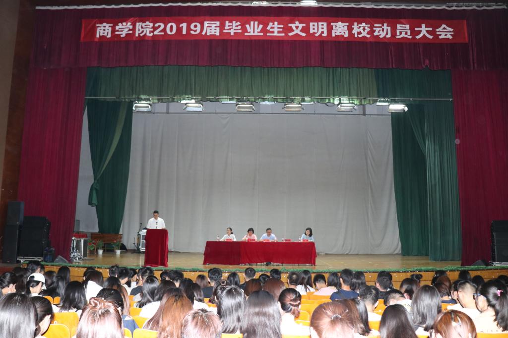 为做好毕业生文明离校教育,确保毕业生安全、文明、有序离校,6月12日,商学院在长江路校区科学会堂召开2019届毕业生文明离校动员大会。商学院全体学生发出文明离校倡议书和承诺书。党总支书记王粲、副书记董兰国,学工办主任兼分团委书记林丰艳,毕业生辅导员孙照、刘心芝和全体毕业生参加会议,林丰艳主持会议。