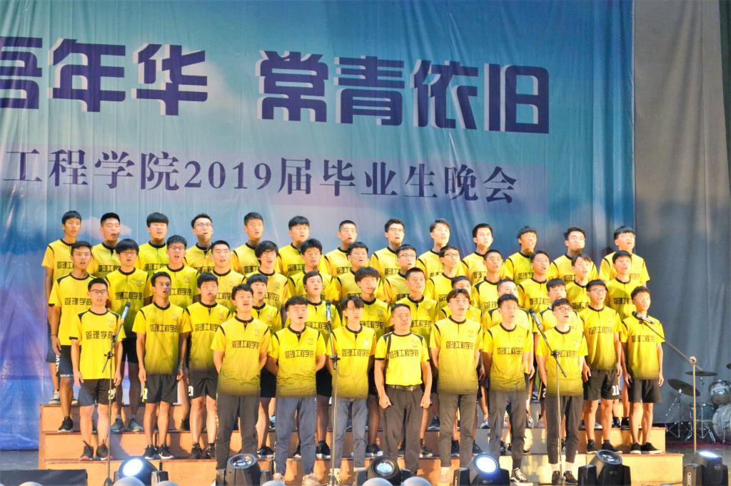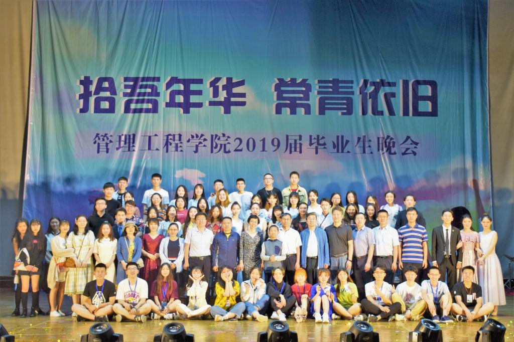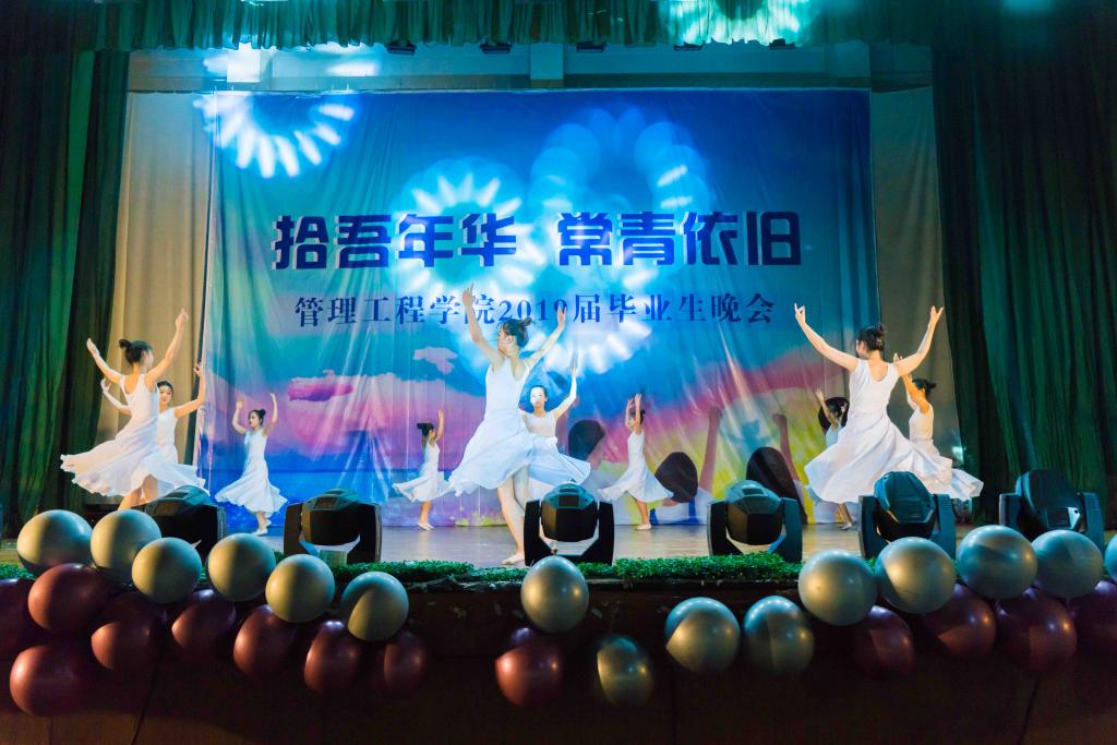 晚上7点,毕业晚会正式开始,随着音乐响起,充满青春活力的舞者从会场后踏着节拍来到舞台前,和着动感的节奏大秀舞技,将他们在大学的灿烂与活力绽放在舞台上。男女对唱歌曲《知否》以悠扬的旋律、古典的歌词陶醉了在场的师生,一首《yesterday once more》表达了毕业生对逝去大学生活的不舍和留恋。旋律动感、舞蹈火热的街舞《Last Time》点燃全场,现代舞《不说再见》以不输专业的高难度舞蹈动作赢得了全场老师和同学的喝彩。管理工程学院足球在申维东的带领下献上了震撼的合唱《足球兄弟》,他们队列整齐、声音洪亮,让每一个在场的观众感受到他们对足球的热爱。旋钮乐队随后上场,身为毕业生的他们为学院舞台带来最后一场表演,《如斯》、《逝去的歌》两首歌为他们在学院舞台的表演画上圆满句号。小品《最后的光》将友情写入末日,他们用搞笑的外衣包裹着即使世界末日,我也会在最后一刻拼命救你的友谊内核。晚会以各毕业班班长、团支书及学生会常委团带来的《六月笙箫》结束,他们激情澎湃,用活力的步伐和律动的舞蹈告诉大家:拾吾年华,常青依旧,青春不散场!