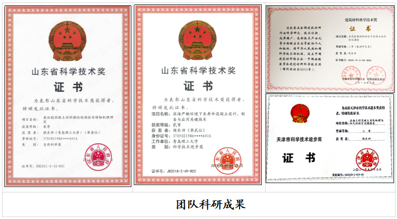 科研成果:近年来,团队主持国家级、省级科研项目30余项;近5年发表SCI论文120余篇,引用超过10000次,出版英文专著2部,中文专著1部。参编国家、行业、地方标准36部。团队获批授权中国发明专利18项,美国发明专利1项,日本发明专利1项,软件著作权7项。团队获山东省自然科学二等奖、天津市科技进步奖二等奖、青岛市科技进步奖一等奖等10余项。